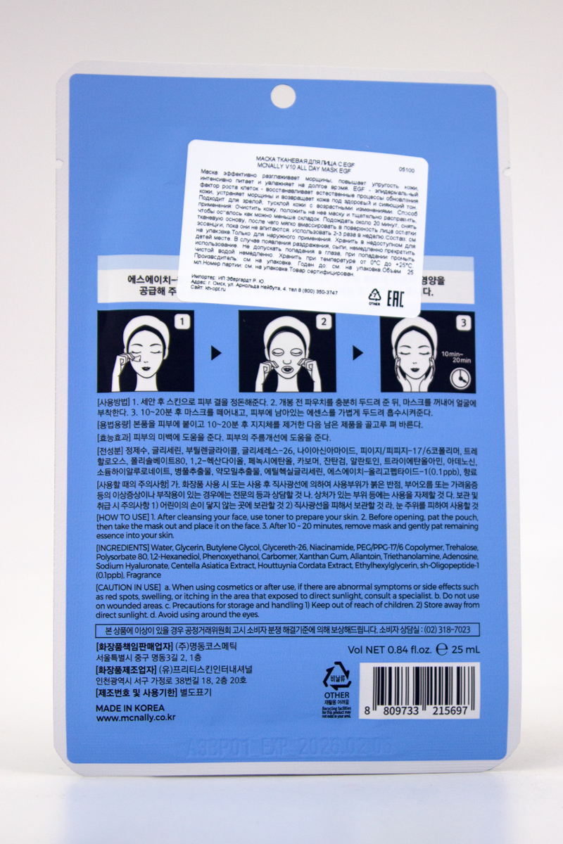 Маска тканевая увлажняющая и питающая с олигопептидами V10 ALL DAY MASK EGF направлена на питание и увлажнение, заживление и регенерацию клеток кожи, снимает покраснения и раздражения. Содержит аллантоин, обладающий заживляющими и успокаивающими свойствами. Ниацинамид укрепляет гидролипидный барьер кожи, сохраняет влагу, нормализует работу сальных желез, сужает поры. Аденозин и гиалуроновая кислота, поддерживают гидробаланс кожи, стимулируют синтез коллагена и эластина, повышают упругость и эластичность кожи, активируют микроциркуляцию и обмен веществ. Экстракт полыни и хауттюйнии снимают раздражение, успокаивают, увлажняют, оказывают антибактериальное действие, являются гипоаллергенными и подходят для чувствительной кожи. Маска дополнительно обогащена эпидермальным фактором роста (олигопептидами), который действует на молекулярном уровне, усиливает синтез собственного коллагена и эластина, ускоряет заживление кожных микроповреждений.