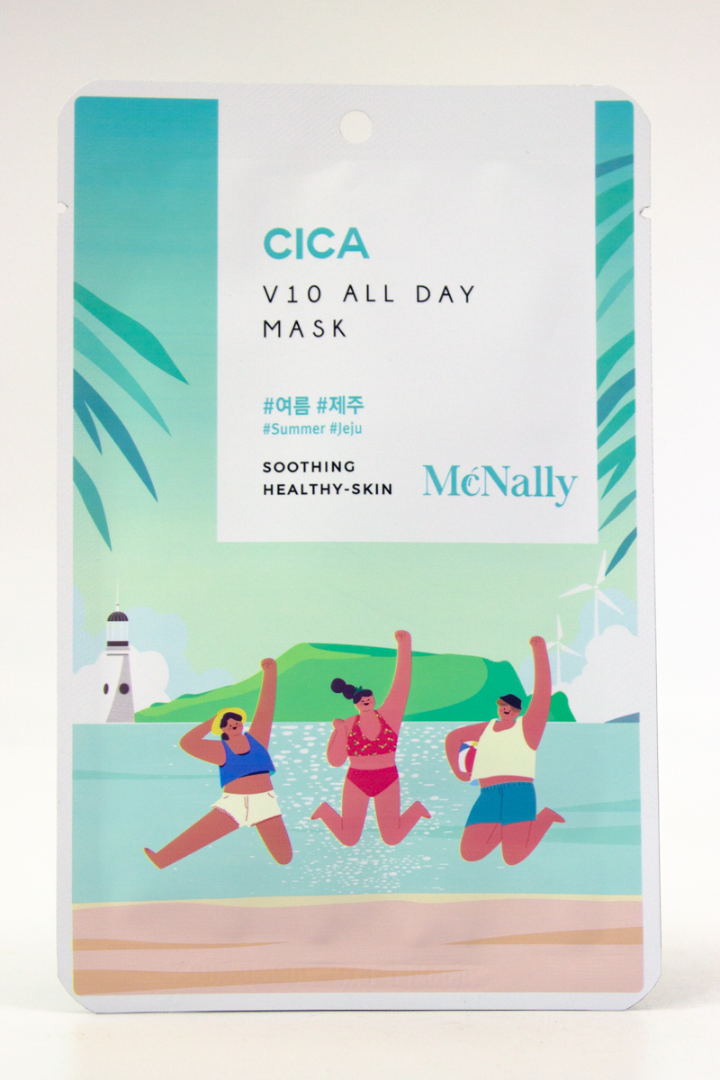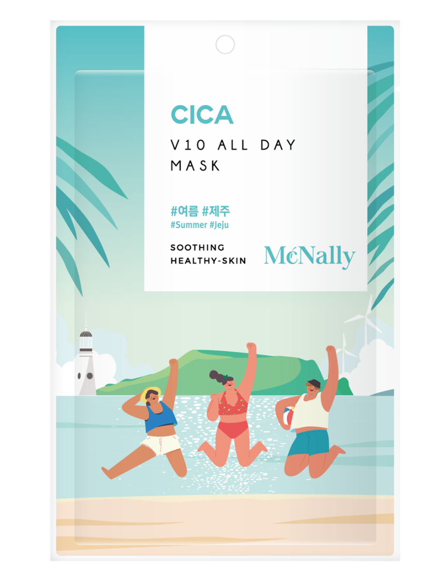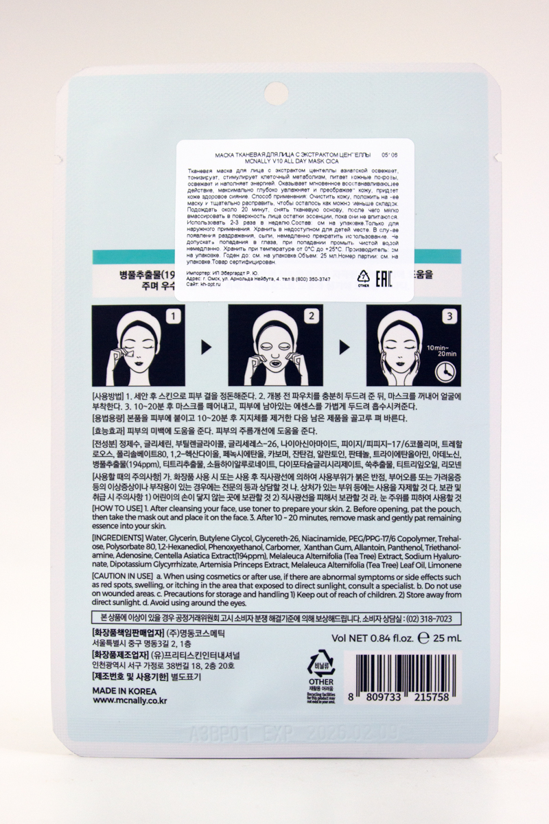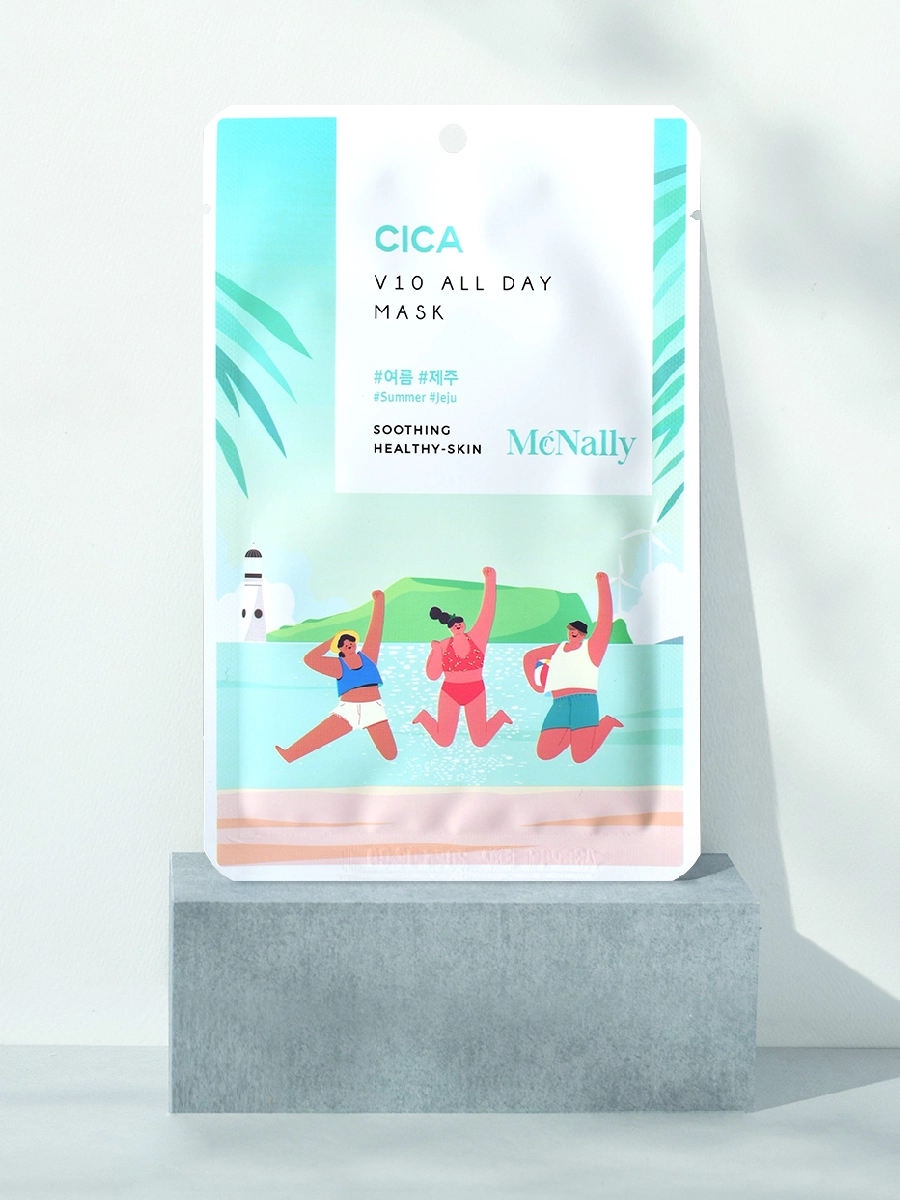 Маска тканевая с экстрактом центеллы азиатской V10 ALL DAY MASK CICA питает и увлажняет кожу, снимает отёки, успокаивает покраснения и раздражения. Содержит аллантоин, обладающий заживляющими и успокаивающими свойствами. Ниацинамид укрепляет гидролипидный барьер кожи, сохраняет влагу, нормализует работу сальных желез, сужает поры. Аденозин и гиалуроновая кислота, поддерживают гидробаланс кожи, стимулируют синтез коллагена и эластина, повышают упругость и эластичность кожи, активируют микроциркуляцию и обмен веществ. Маска обогащена экстрактами центеллы, чайного дерева и полыни которые обладают заживляющими свойствами, укрепляют капилляры кожи, устраняют раздражения, покраснения и зуд, нормализуют выработку себума, стимулируют обновление клеток.